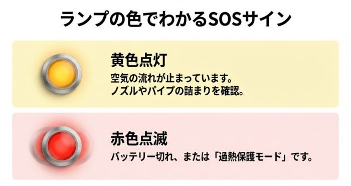 黄色いランプが点灯している場合は、ノズルやパイプのどこかが詰まって空気の流れが止まっているサインであることが多いです。