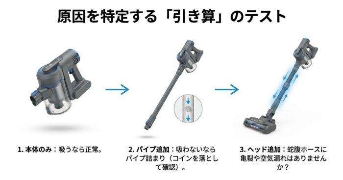 まずはヘッドとパイプを外し、本体だけで吸ってみてください。これでしっかり吸うなら本体は正常です。