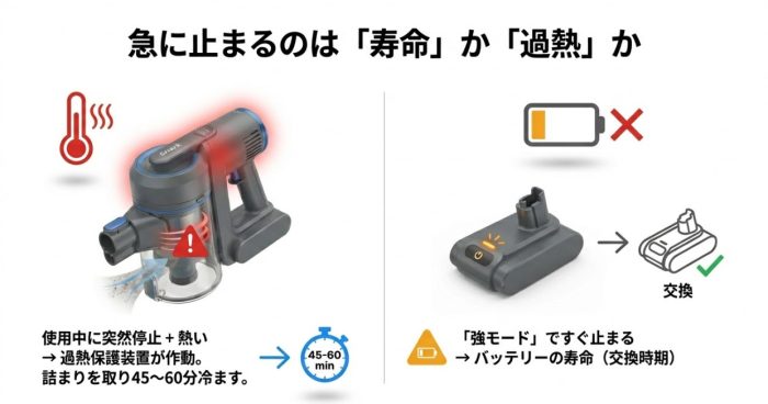 使っている途中で急に止まってしまうのは、バッテリーの劣化か、モーターの熱による安全装置の作動かもしれません。