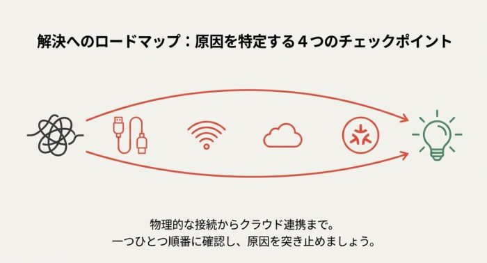 複雑に見える不具合も、大抵は「純正ケーブルを使っているか」「2.4GHzのWi-Fiか」「スキルの再リンクは試したか」という基本項目に集約されます。