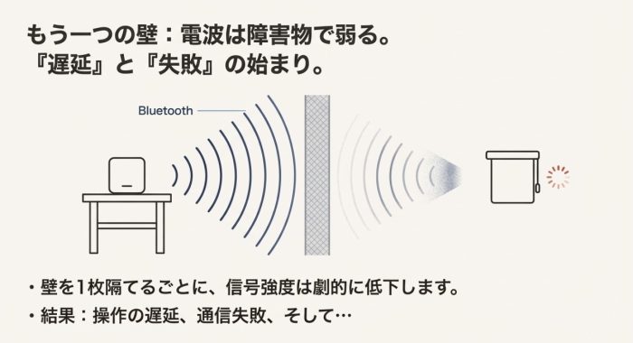 信号が弱くなると、アプリでの操作が反映されるまでに数秒のラグが発生したり、最悪の場合は「通信失敗」となってしまいます。