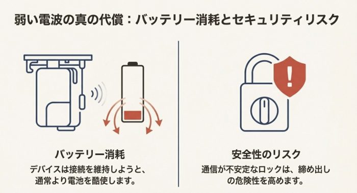 デバイスはハブとの接続を維持しようとして、より大きな出力で電波を飛ばそうとしたり、何度も再送を繰り返したりするため、通常よりも電池を酷使してしまうんです。
