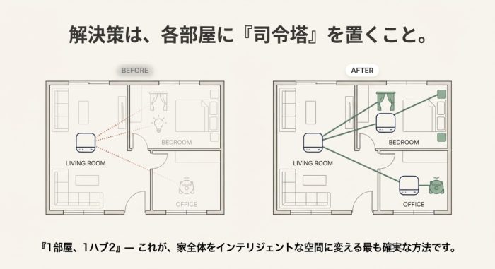 エアコン、テレビ、照明、扇風機といった赤外線リモコンで動く家電が各部屋にある場合、その部屋ごとにハブ2を配置することが、誤作動や無反応を防ぐ唯一の確実な方法です。