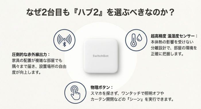 しかし、あえて2台目もハブ2を選ぶことで、家全体の操作クオリティが劇的に向上するんです。