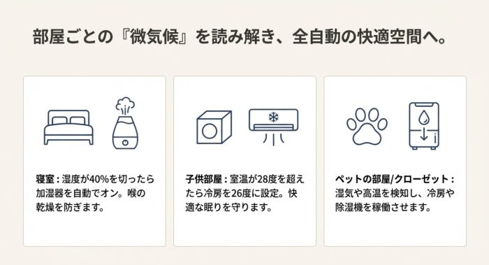 「寝室の湿度が40%を切ったら加湿器をつける」「子供部屋が28度を超えたら冷房を26度で設定する」といった、パーソナライズされた快適空間が自動で作られます。