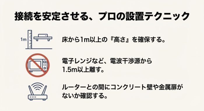 「別の部屋に置いたら急につながらなくなった!」というトラブルを防ぐため、さらに一歩踏み込んだ最適化についてお話しします。