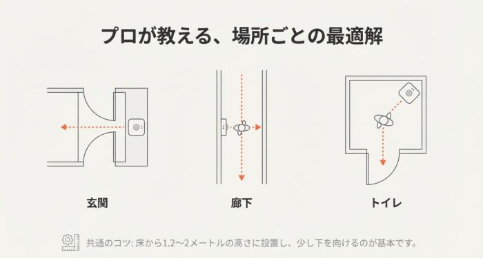 | トイレ | 入り口の正面または少し横 | 扉の開閉に反応しすぎないよう感度を調整 |