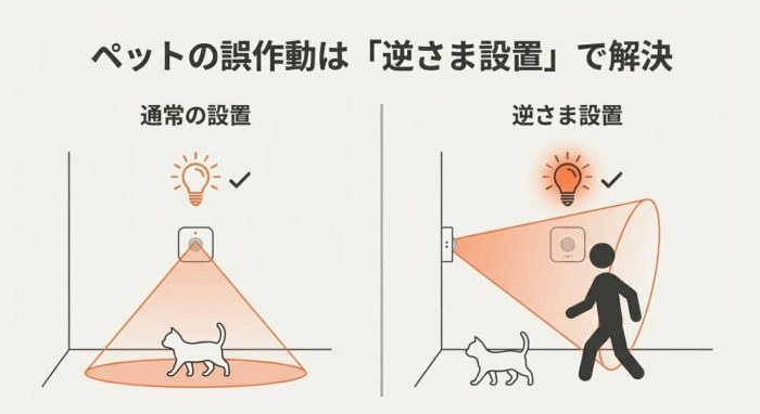 室内で犬や猫を飼っているご家庭にとって、人感センサーの最大の敵は「ペットによる誤作動」ですよね。仕事から帰ってきたら、誰もいないはずの部屋の電気が煌々とついている……なんて経験、飼い主さんならあるあるではないでしょうか。これを防ぐために開発されたのが、センサーを上下逆さまにするというユニークなテクニックです。本来、人感センサーは下方向の広範囲をカバーするように設計されていますが、これを逆さまに設置することで、検知範囲を「上方向」へとシフトさせることができるんです。