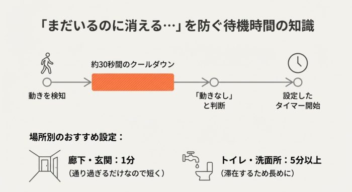 逆に、トイレなどで「まだ中にいるのに電気が消えてしまった」という場合は、この待機時間を長めに設定するか、後述する存在センサーの併用を検討する必要があります。人感センサーはあくまで「動き」を検知するものなので、じっと座っていると「誰もいない」と判断されてしまうのは宿命です。自動消灯までの時間を「5分」など長めに設定しておくことで、ある程度の静止状態には耐えられるようになります。自分の生活リズムに合わせた最適な時間を、根気よく見極めていくのが使いこなしのコツですね。