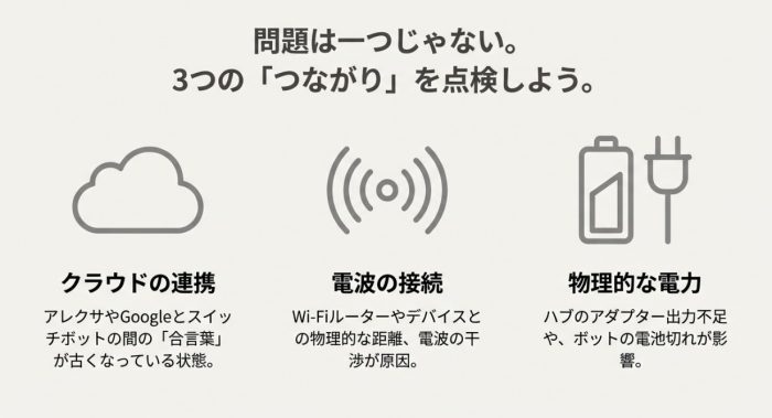 スイッチボットが動かなくなる背景には、いくつかの共通したパターンがあります。