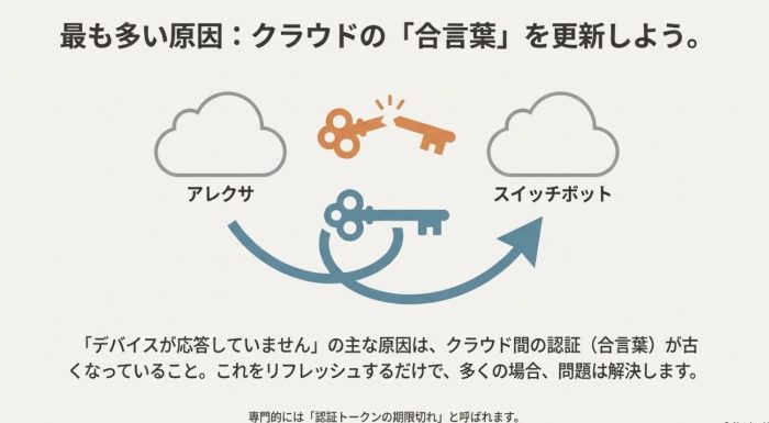 これはデバイス自体の故障ではなく、Amazonとスイッチボットを繋いでいる「合言葉(トークン)」が期限切れになっている可能性が高いです。