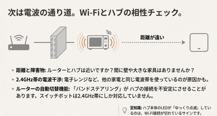 よくあるのが、ハブとWi-Fiルーターの間の距離が遠すぎたり、間に壁や大きな家具があったりする場合です。