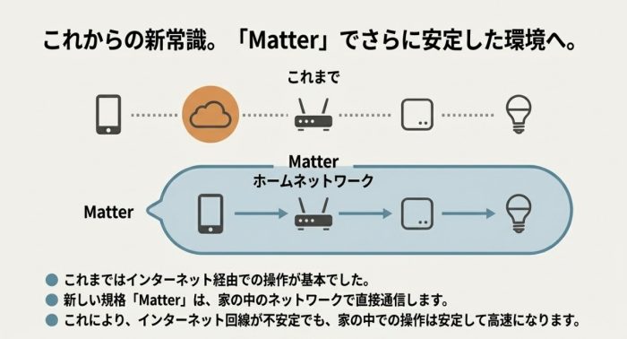 今までの通信は一度インターネット(クラウド)を経由していましたが、Matterを使うと家の中のネットワークで直接やり取りができるようになります。
