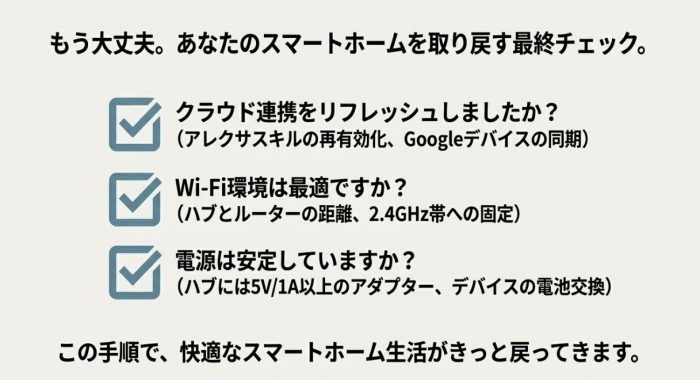 数値データなどはあくまで目安ですので、正確な情報は公式サイトをご確認くださいね。最終的な判断は専門家にご相談ください。あなたのスマートホームが、また快適に動き出すことを願っています!