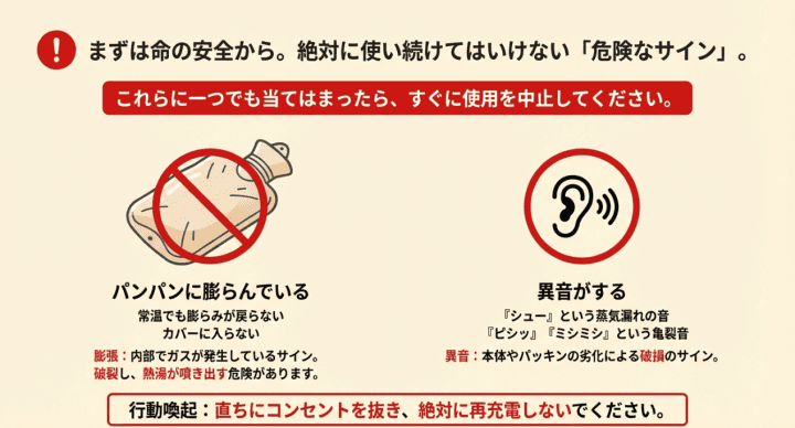 一方で、もし本体がパンパンに膨らんでいたり、異音がしたりする場合は、直ちに使用を中止すべき危険なサインの可能性もあります。