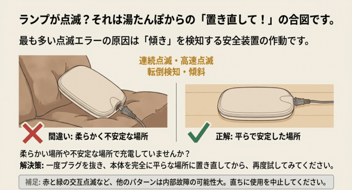点滅している平らな場所に置く(転倒検知のリセット)。