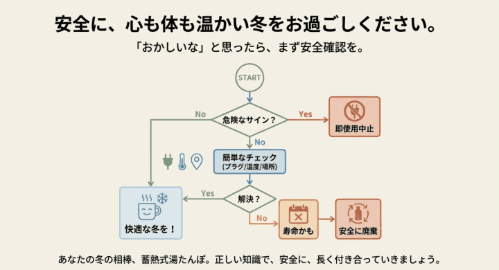 蓄熱式湯たんぽは、シンプルな道具に見えて、実はデリケートな家電製品です。「おかしいな」と思ったら、無理に使わず、このチェックリストを思い出してください。