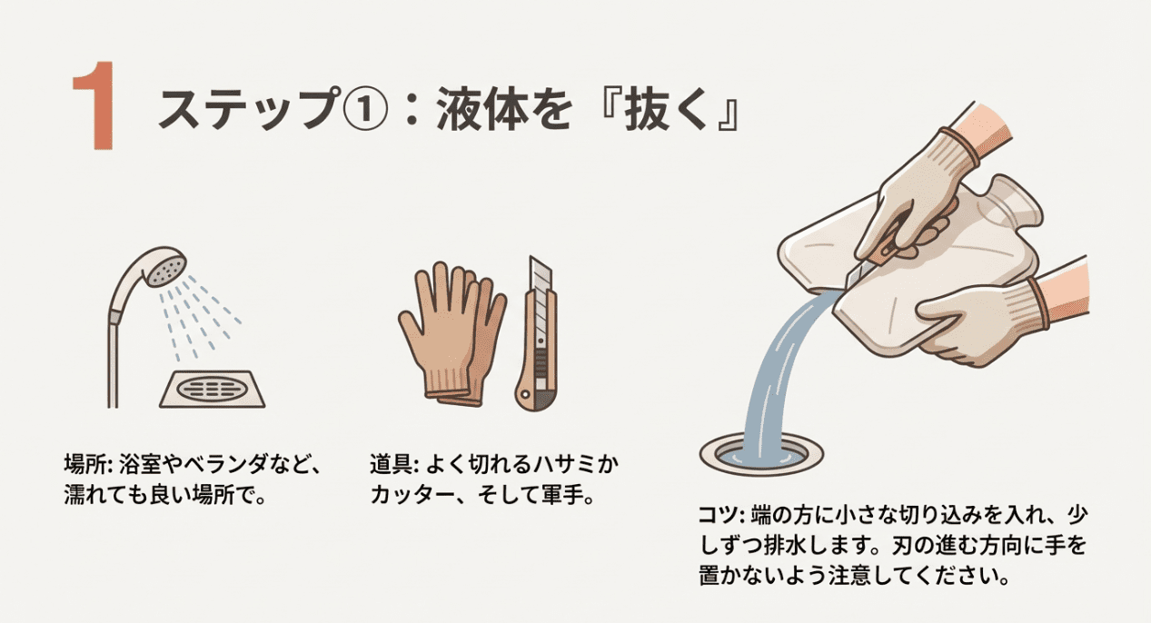 自治体のルールで「中身を空にしてから捨ててください」と指定されている場合、蓄熱液を抜く作業が必要になります。