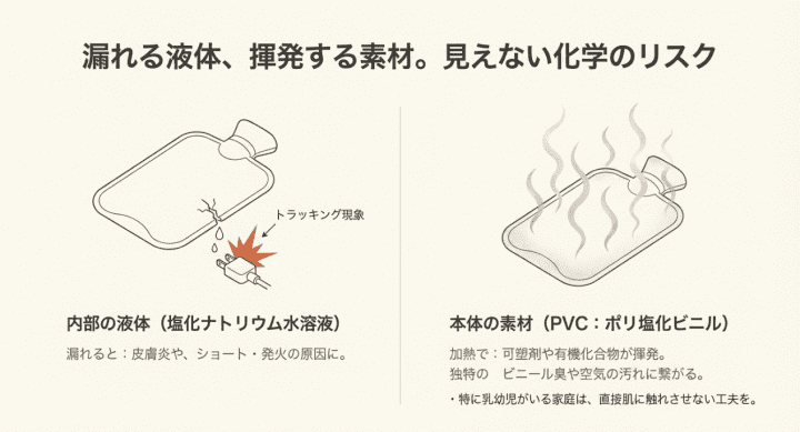 熱を加える湯たんぽという製品の性質上、常温の時よりも化学物質が揮発しやすくなったり、カバーを突き抜けて微量が肌に移行したりする可能性はゼロではありません。
