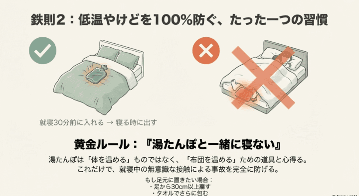 それは、「湯たんぽと一緒に寝ない」というルールを徹底することです。