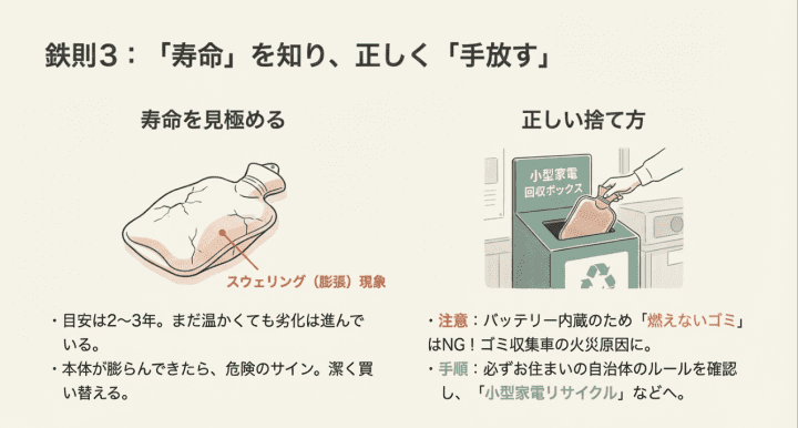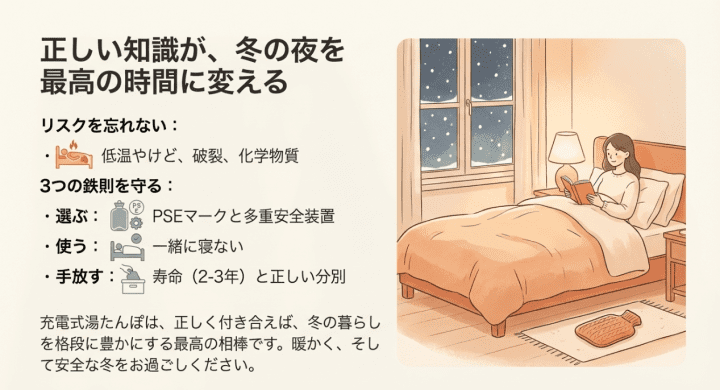 これさえ守れば、充電式湯たんぽは冬の暮らしを格段に快適にしてくれる最高の相棒になります。
